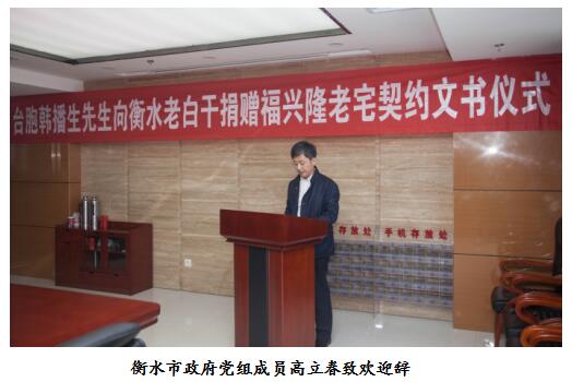 首先,由衡水市政府黨組成員高立春致歡迎辭:韓家先輩遠(yuǎn)赴臺(tái)灣,對(duì)衡水一片癡心縈系了70余年,傳承了祖孫三代,今天三位親臨衡水,在寒冷的冬天為衡水及衡水老白干帶來了涓涓暖流。今天在這里隆重舉行福興隆老宅契約文書捐贈(zèng)儀式,我們真誠感謝韓播生先生一行帶來彌足珍貴的歷史資料,既是對(duì)衡水老白干歷史沿革的挖掘,又是衡、臺(tái)文化交流的一筆重彩,必將有助于推動(dòng)衡、臺(tái)文化的交流和發(fā)展,讓我們對(duì)韓先生一行表示敬意,讓我們共同祝愿衡水老白干的明天更加美好!